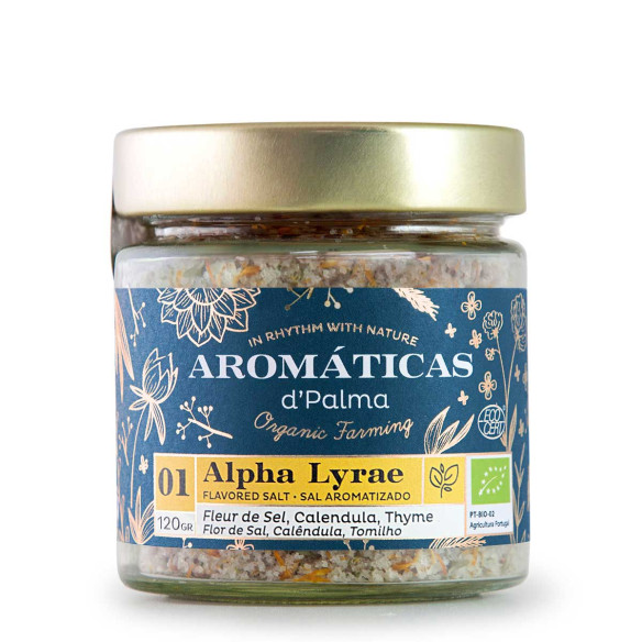 Inspirado na estrela mais brilhante da constelação de Lira também conhecida por Vega, Alpha Lyrae é uma mistura à base de Flor de Sal do Algarve, e das nossas aromáticas biodinâmicas: Calêndula e Tomilho Vulgar. Esta mistura foi especialmente selecionada para pratos vegetarianos. Com um paladar salgado e levemente aromático.