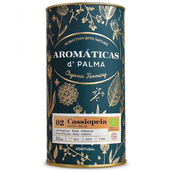 Inspirada na constelação em formato de W, Cassiopeia é uma tisana bastante aromática de cor vibrante, de aromas cítricos e florais e sabor equilibrado, resultado da mistura das nossas aromáticas biodinâmicas. É uma tisana que remete aos sentidos e à descontração, plena de propriedades medicinais para quem pretende uma bebida relaxante repleta de antioxidantes.